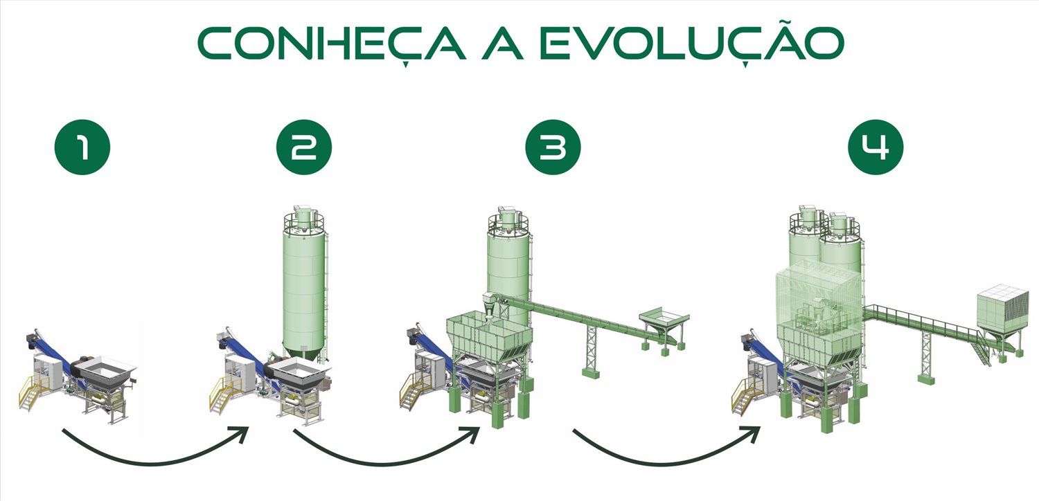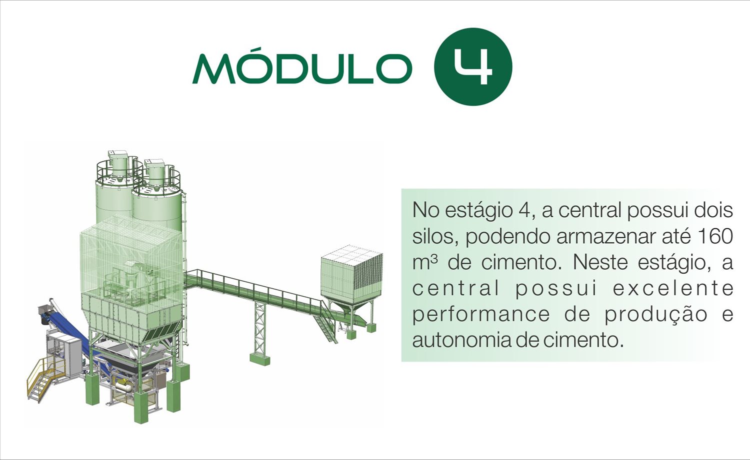 Módulo 4 - Neste módulo, a central possui dois silos, podendo armazenar até 160 m³ de cimento.Neste estágio, a central possui excelente performance de produção e autonomia de cimento.