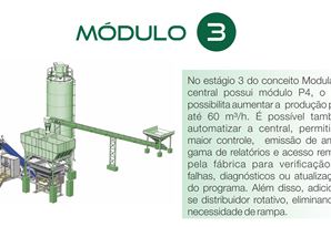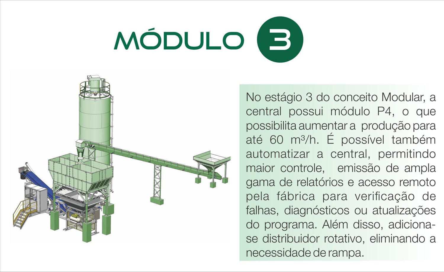 Módulo 3 - A central possui módulo P4, o que possibilita aumentar a produção para até 60 m³/h. É possível também automatizar a central, permitindo maior controle, emissão de ampla gama de relatórios e acesso remoto pela fábrica para verificação de falhas, diagnósticos ou atualizações do programa. Além disso, adiciona-se distribuidor rotativo, eliminando a necessidade de rampa.