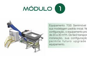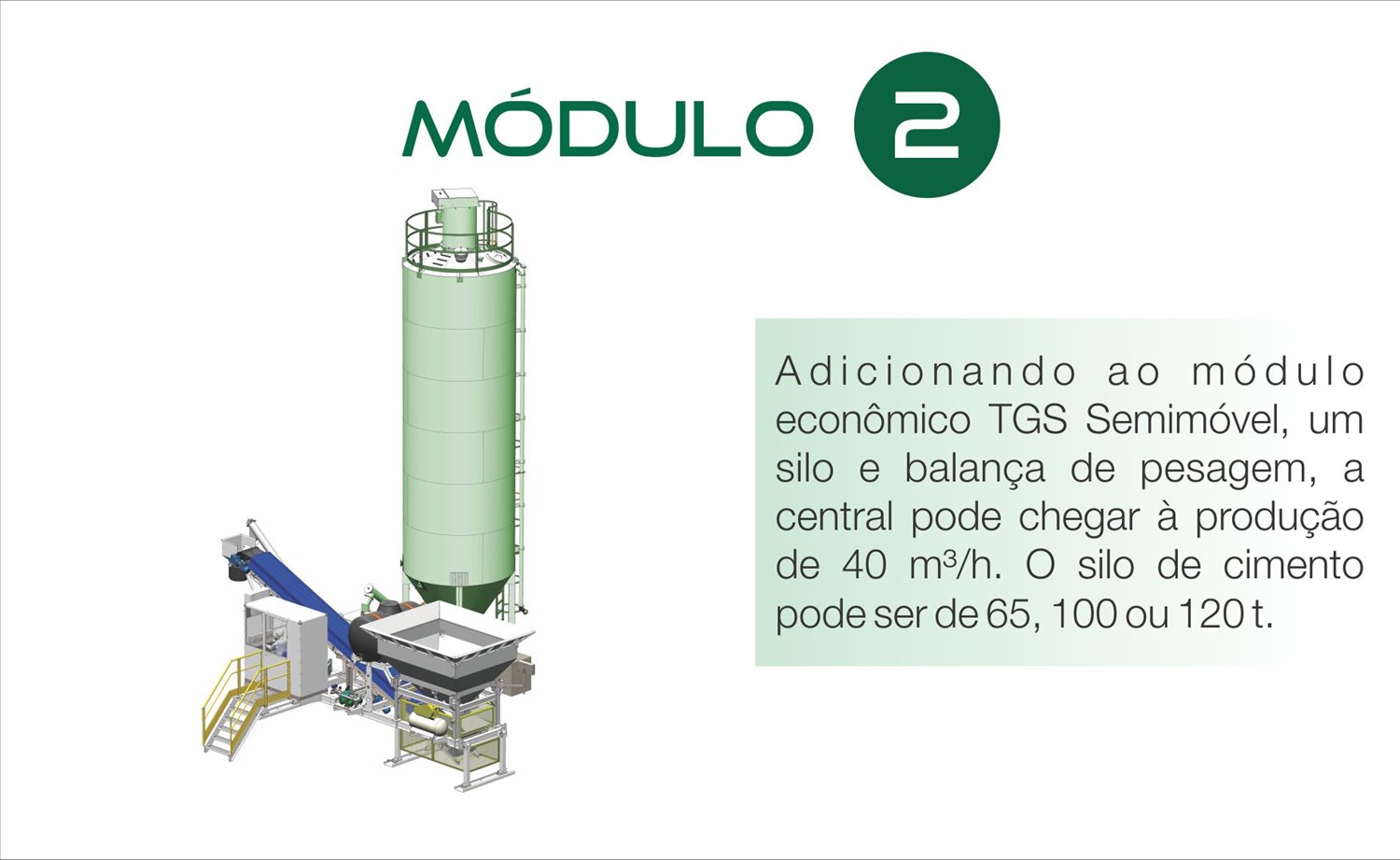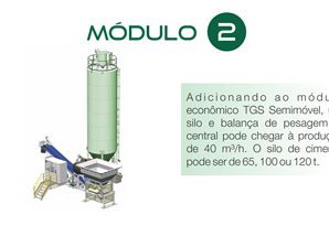 Módulo 2 - Adicionando ao módulo econômico TGS Semimóvel, um silo e balança de pesagem, a central pode chegar à produção de 40 m³/h. O silo de cimento pode ser de 65, 100 ou 120 t.