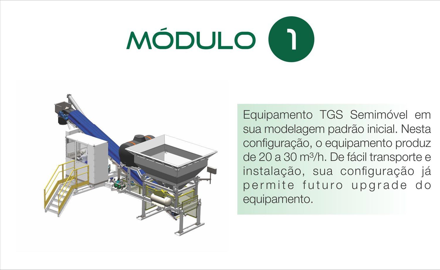 Módulo 1 - Equipamento TGS Semimóvel em sua modelagem padrão inicial. Nesta configuração, o equipamento produz de 20 a 30 m³/h. De fácil transporte e instalação, sua configuração já permite futuro upgrade do equipamento.